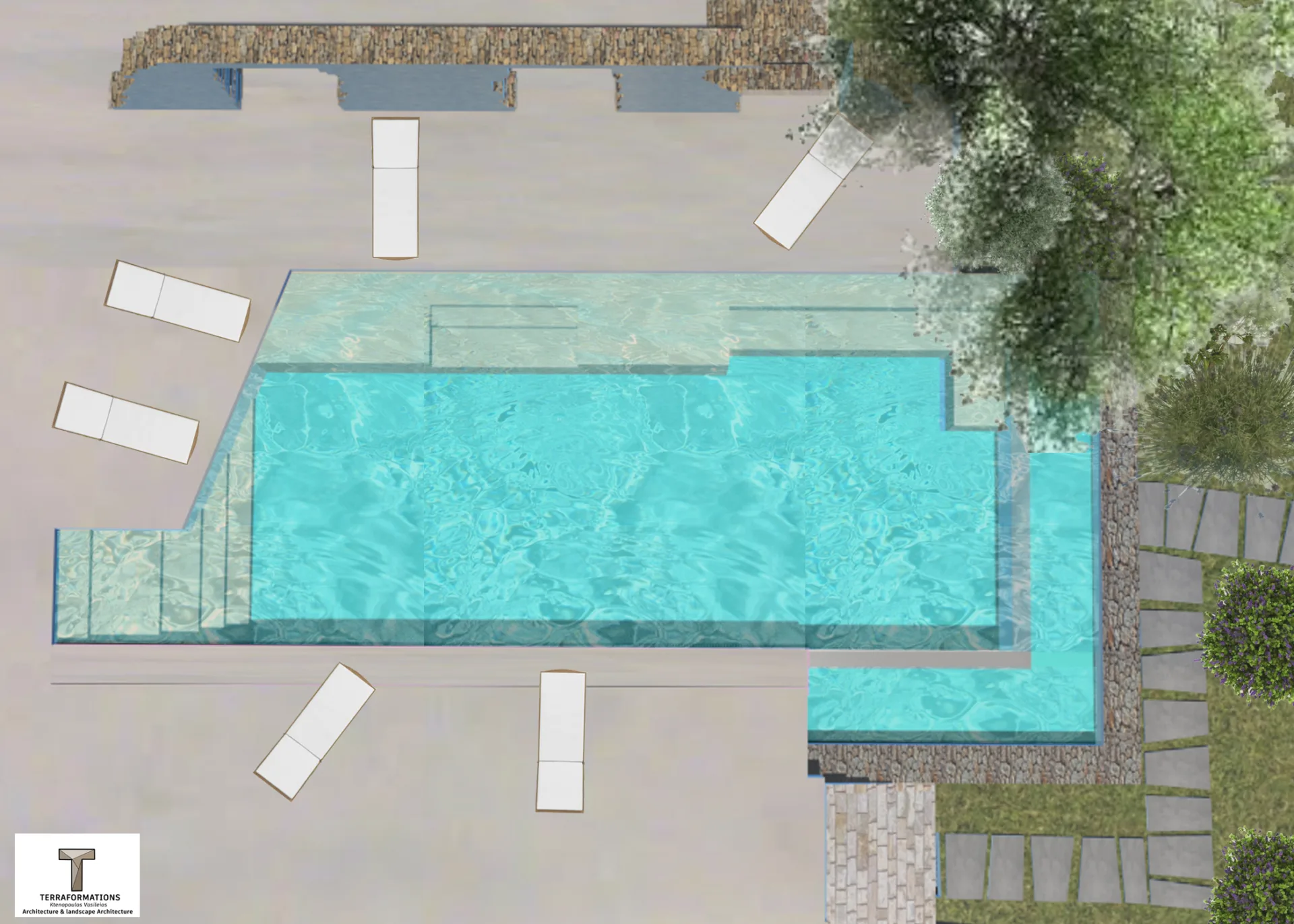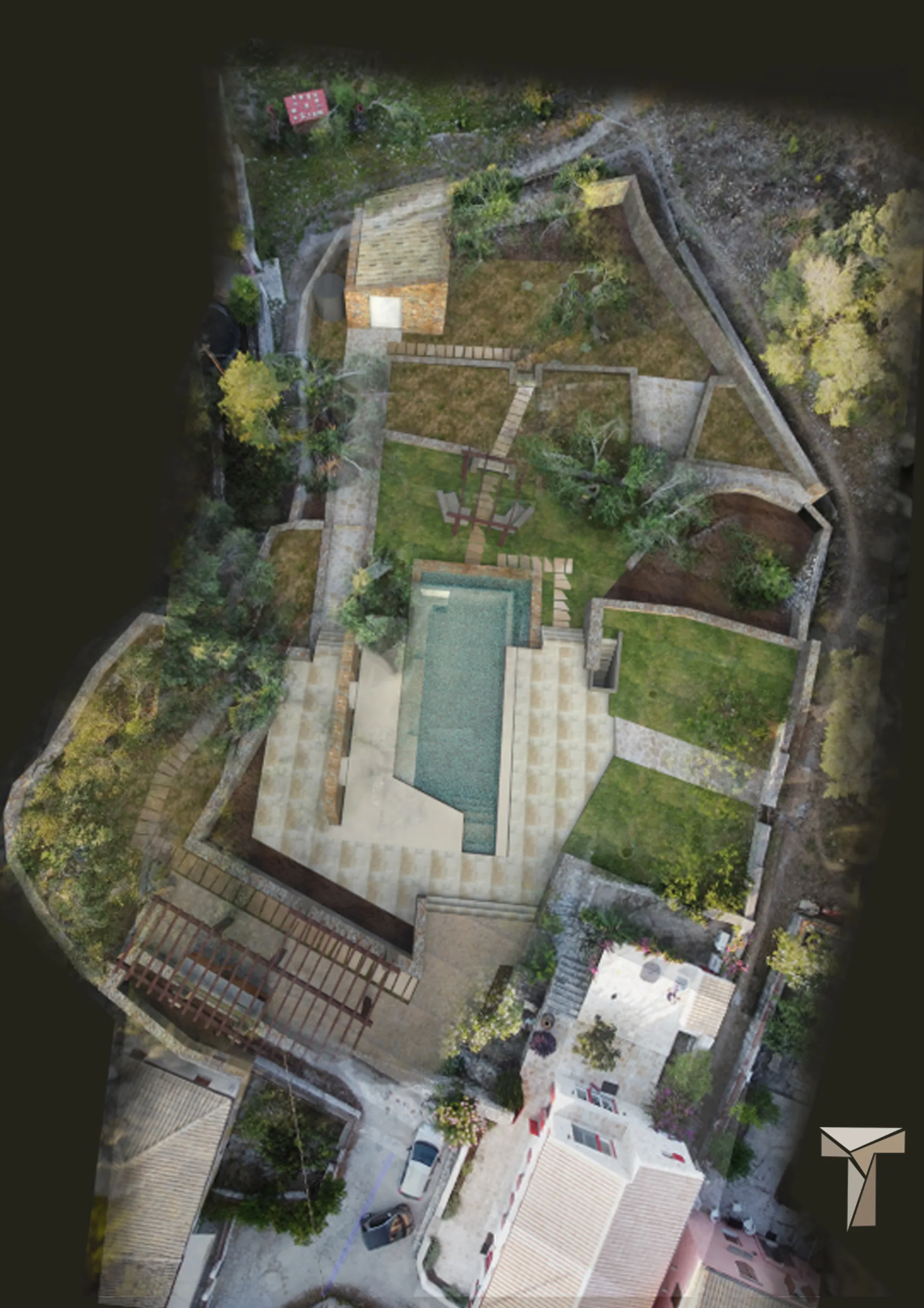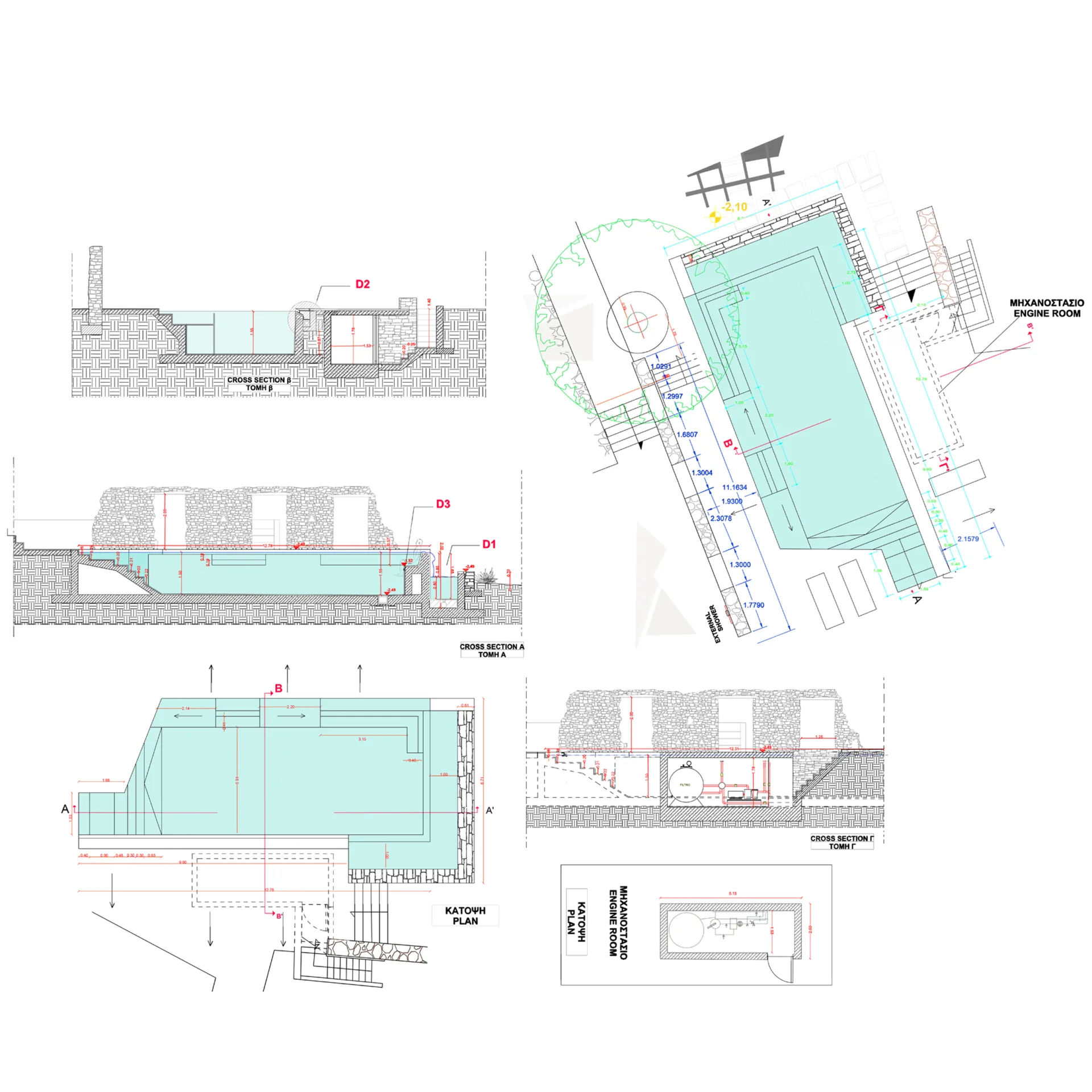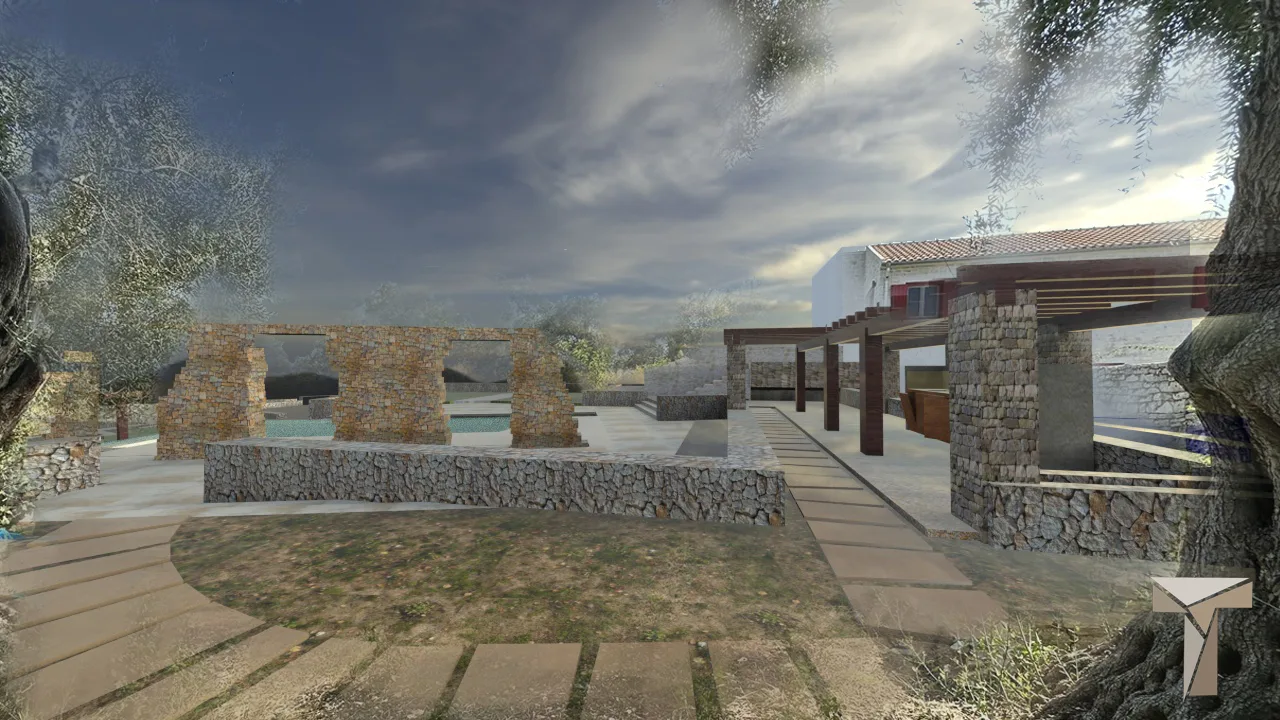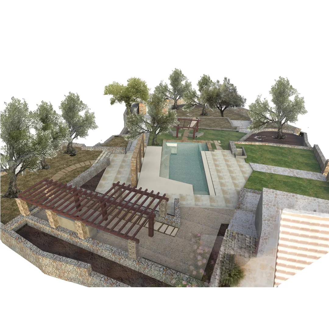 Located in Ionian islands , this old restored house, preserves the morphology of the original one. In this case, we turned the pool in search of a completely new situation. As we delved into the design, we kept the existing formation respecting the old Greek tradition while preserving the memory of the landscape. The main idea is combined with a theatrical old dilapidated wall with openings that frames the old olive trees in a linear repetition referring to the old cisterns and baths. The experience while swimming t creates a variety of properties along its length.