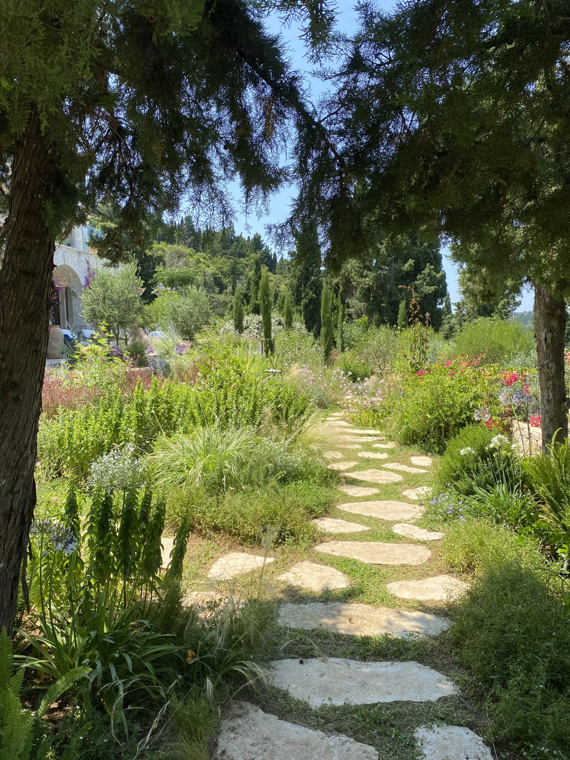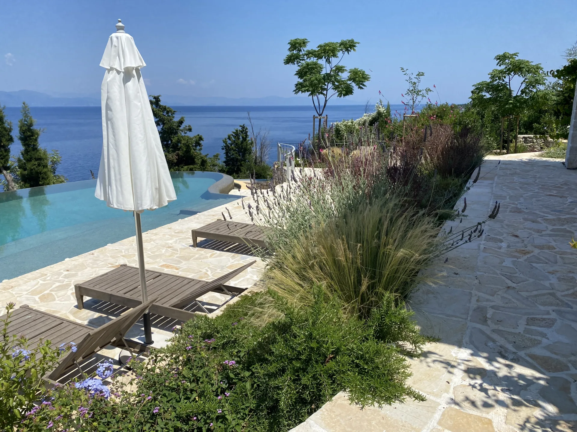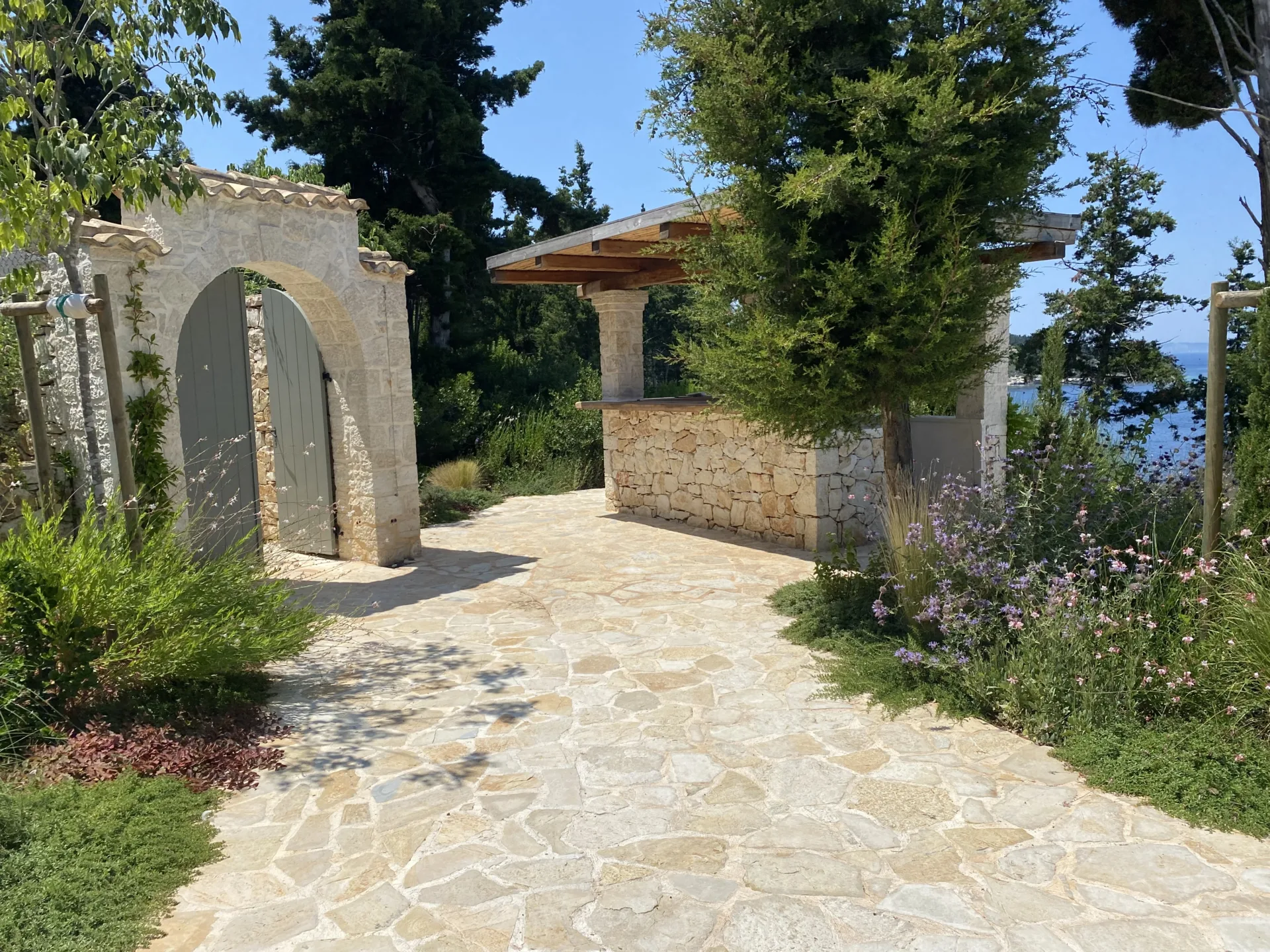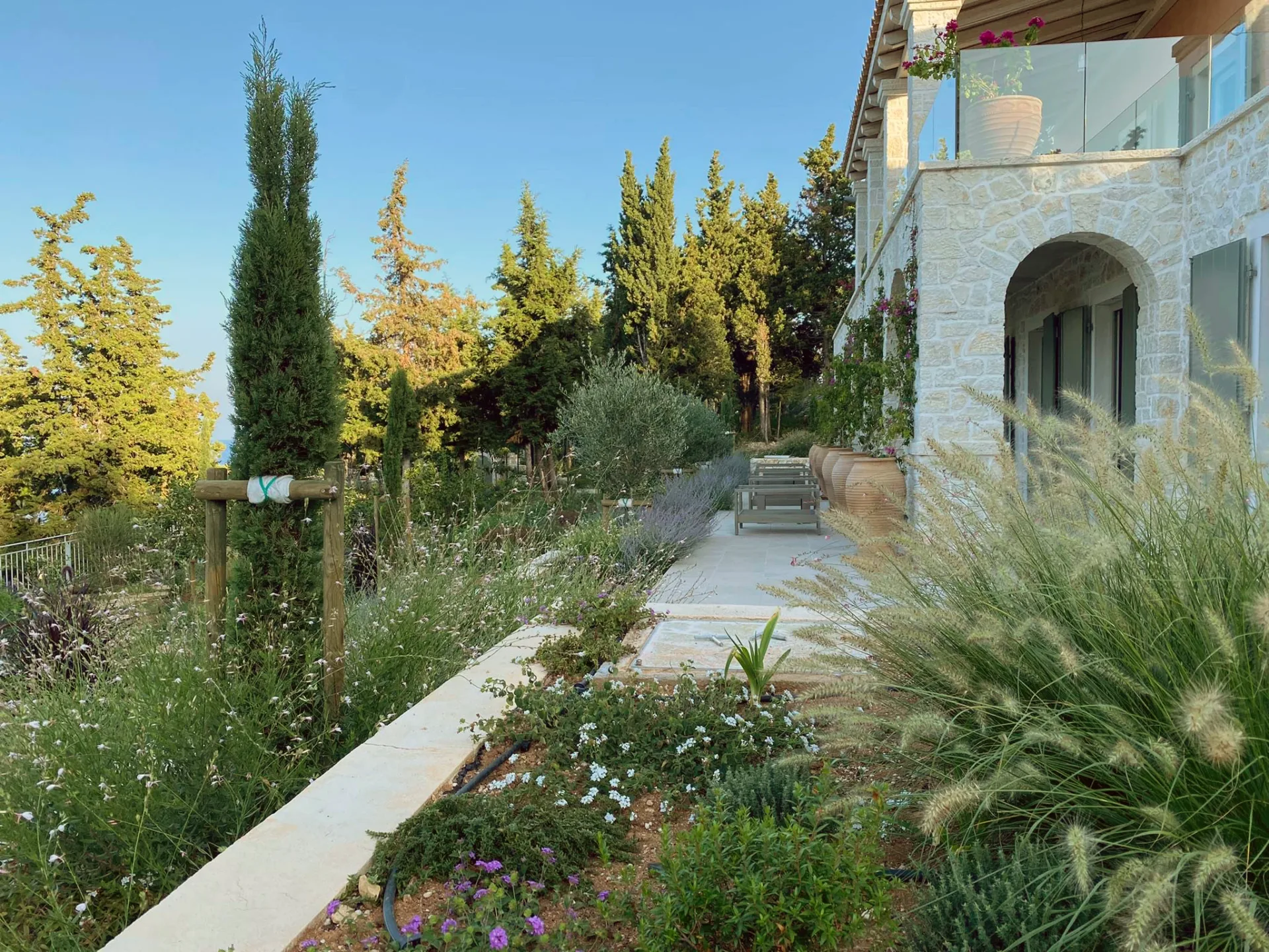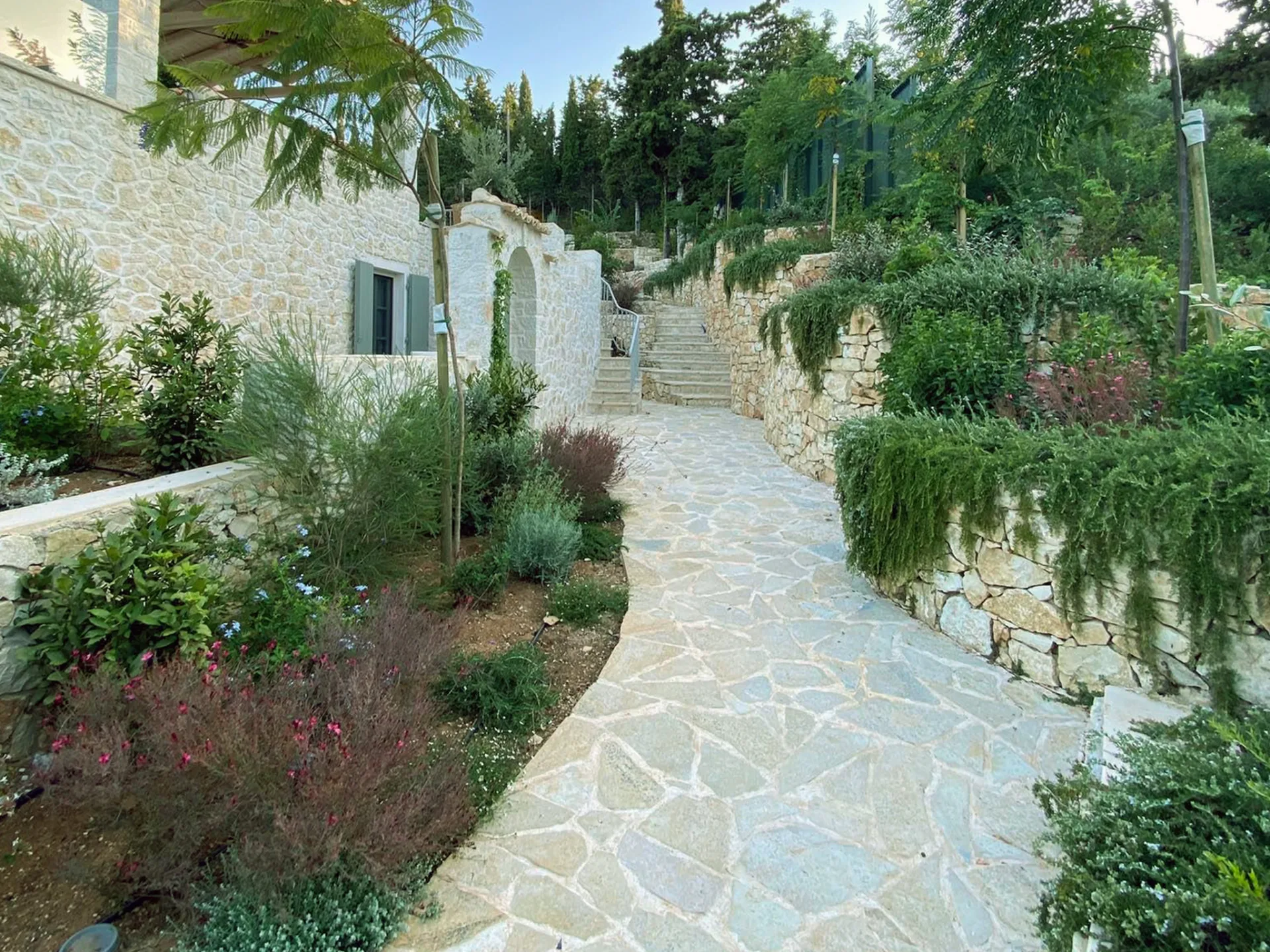 Located οn Ionian Islands, in this plot the clients have invested carefully by giving the appropriate importance to the visitor’s experience in the Mediterranean landscape. Surrounded by a lush coniferous forest, the amphitheatrical space that surrounds the building leads to the surrounding facilities like the outdoor swimming pool. Passing through a spectacular arched pergola made of climbing wisteria the element of surprise can make you enjoy a spectacular view in the Ionian Sea. Citrus trees, jujubes, almonds, lavender, schinus are just some of the plant species that make up the landscape.