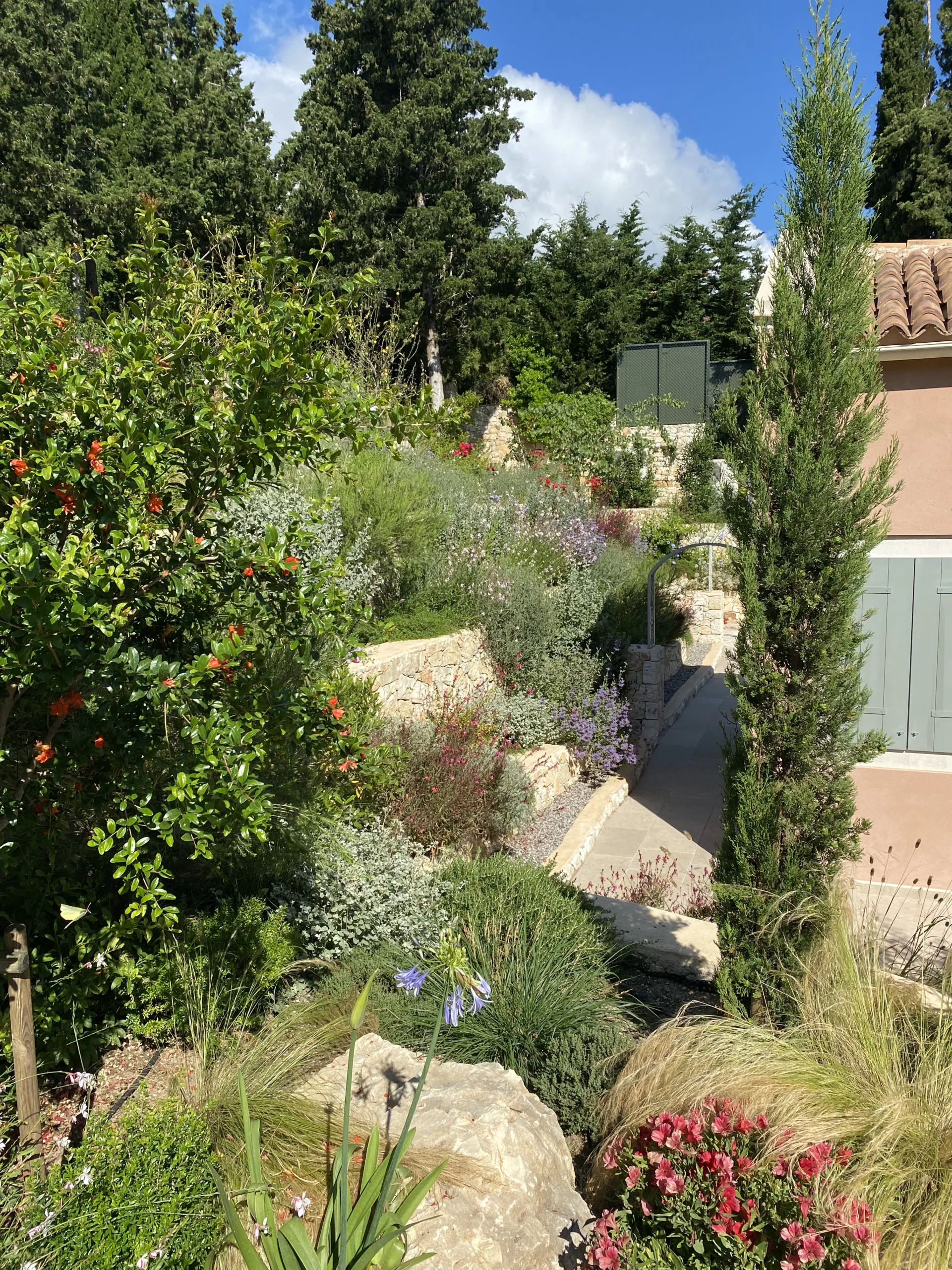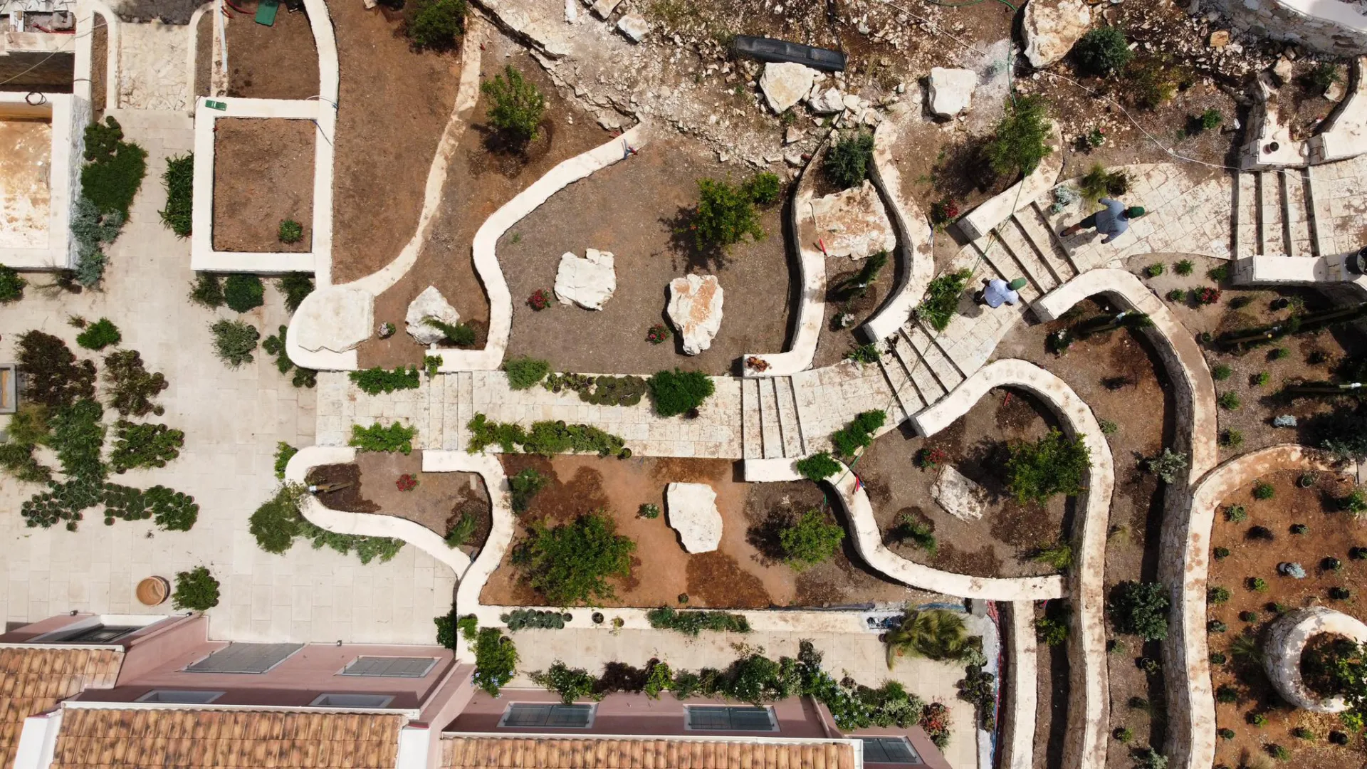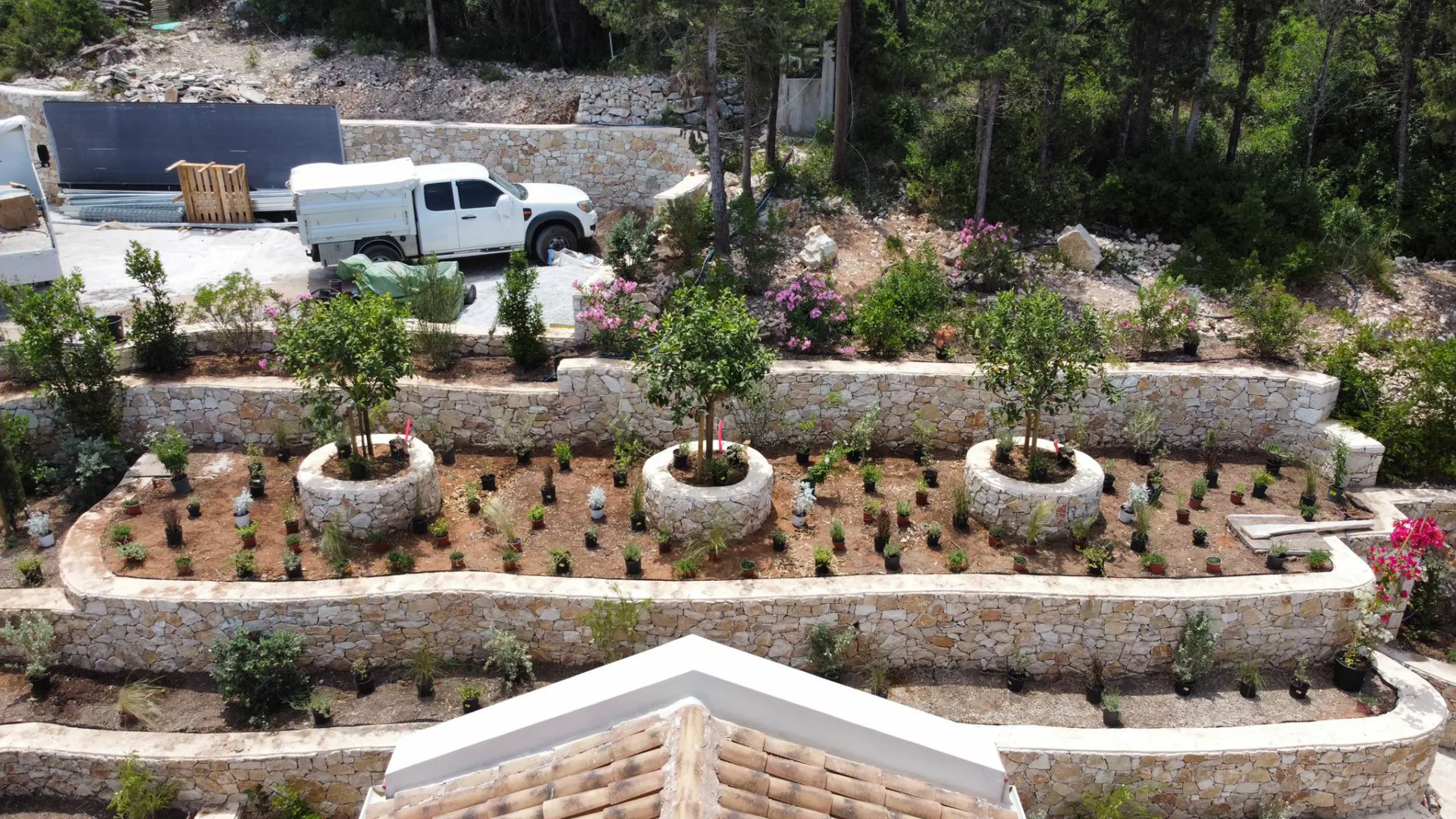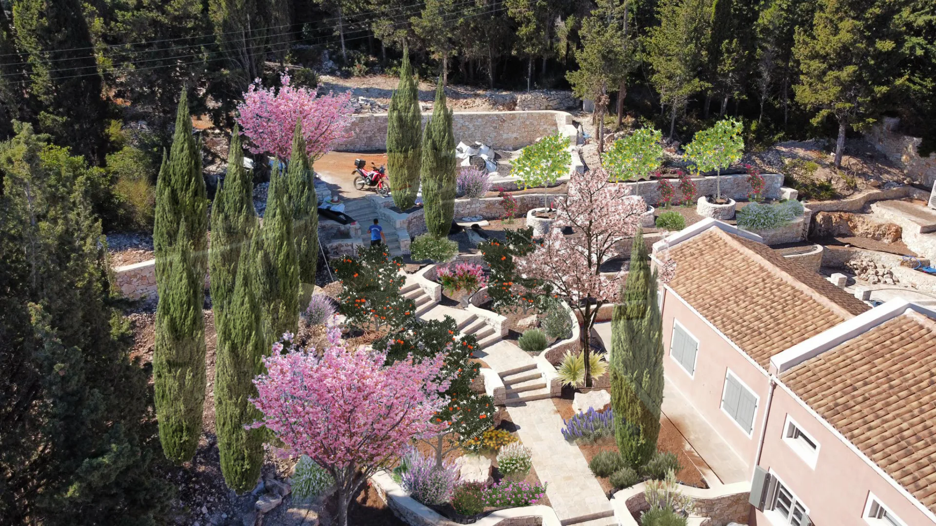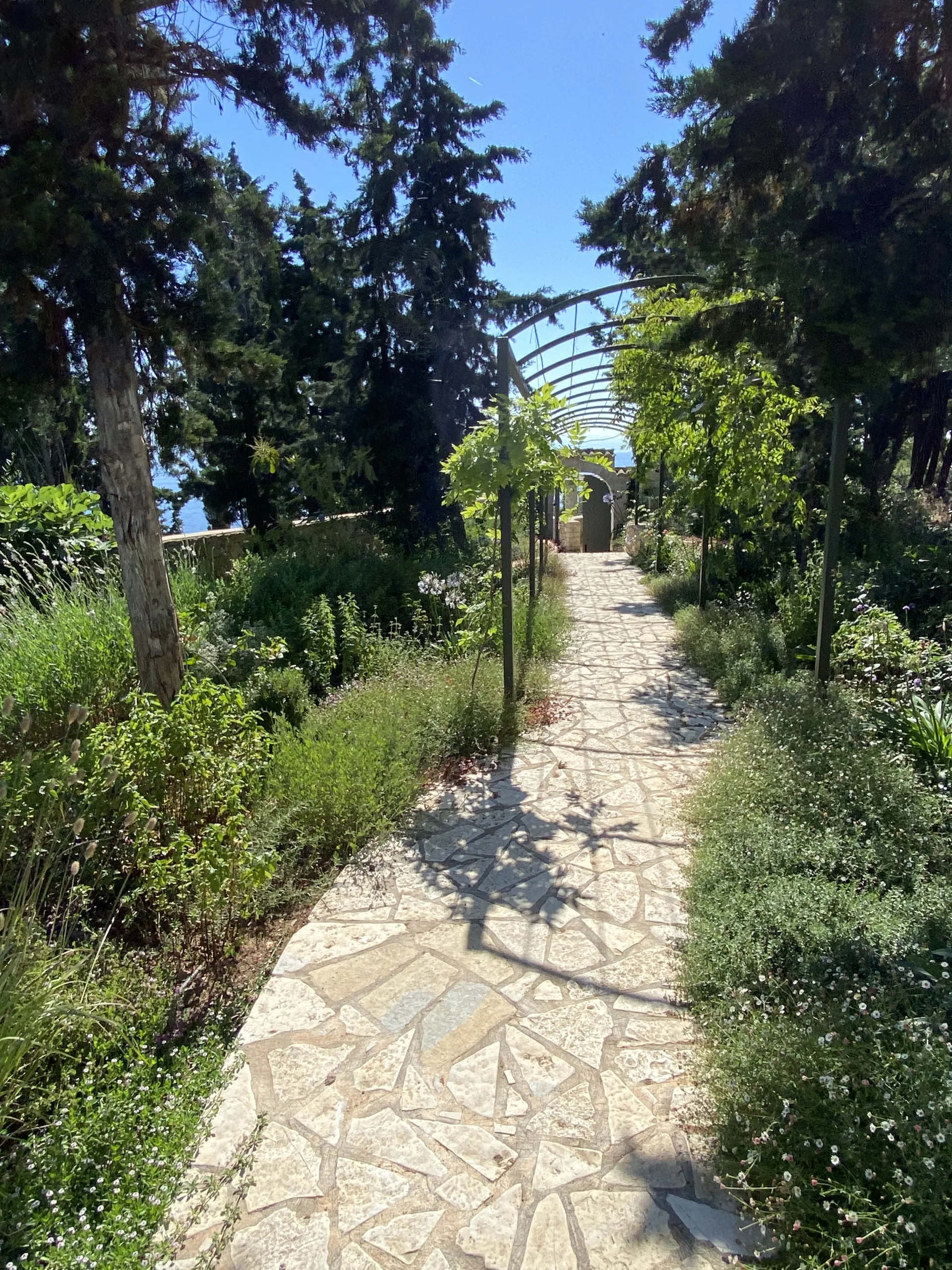 Located οn Ionian Islands, in this plot the clients have invested carefully by giving the appropriate importance to the visitor’s experience in the Mediterranean landscape. Surrounded by a lush coniferous forest, the amphitheatrical space that surrounds the building leads to the surrounding facilities like the outdoor swimming pool. Passing through a spectacular arched pergola made of climbing wisteria the element of surprise can make you enjoy a spectacular view in the Ionian Sea. Citrus trees, jujubes, almonds, lavender, schinus are just some of the plant species that make up the landscape.