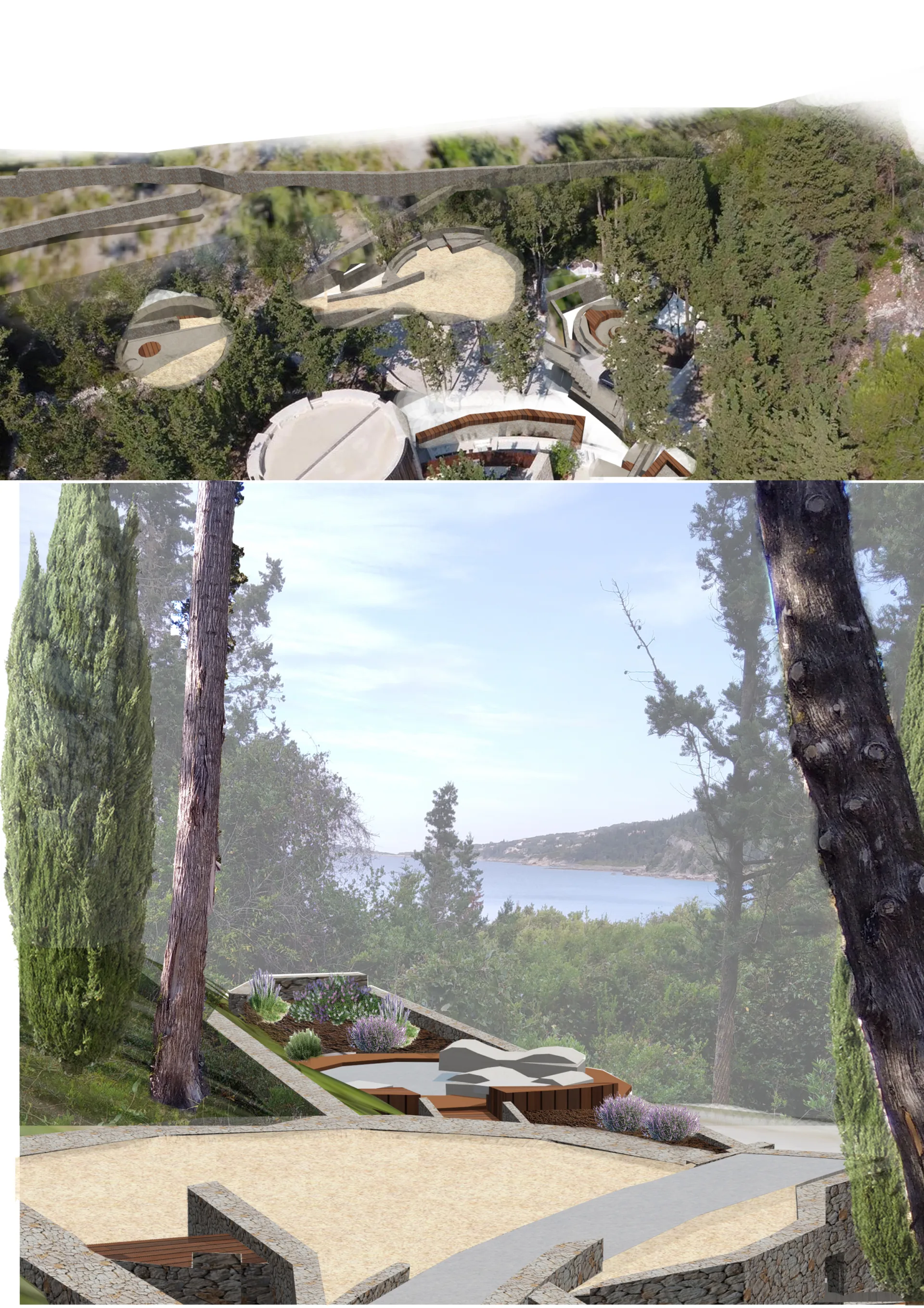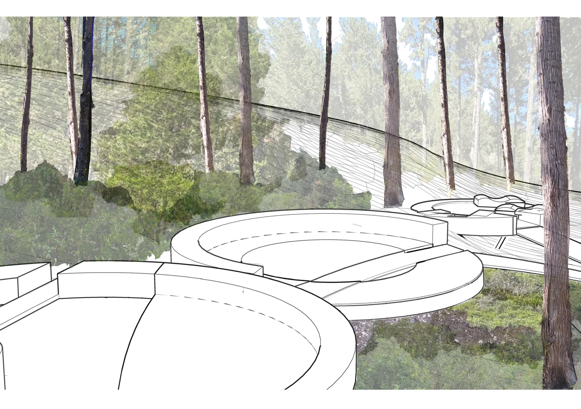 The architectural plan idea of villa Kipiadi as described is composed by 4 circular platforms of different sizes and synthesis.