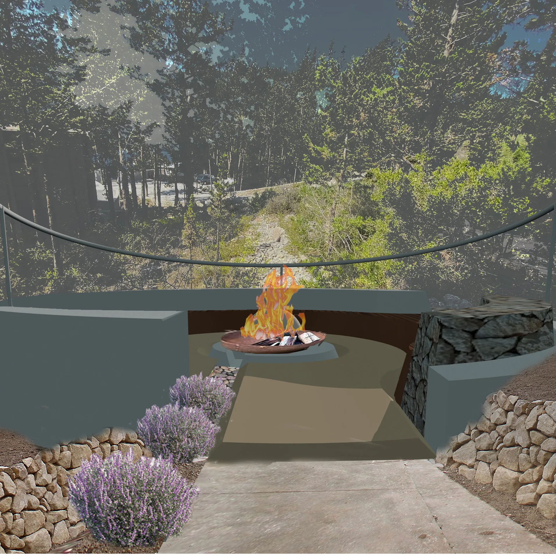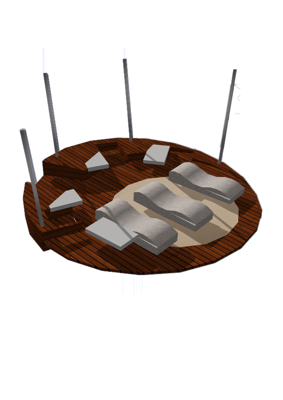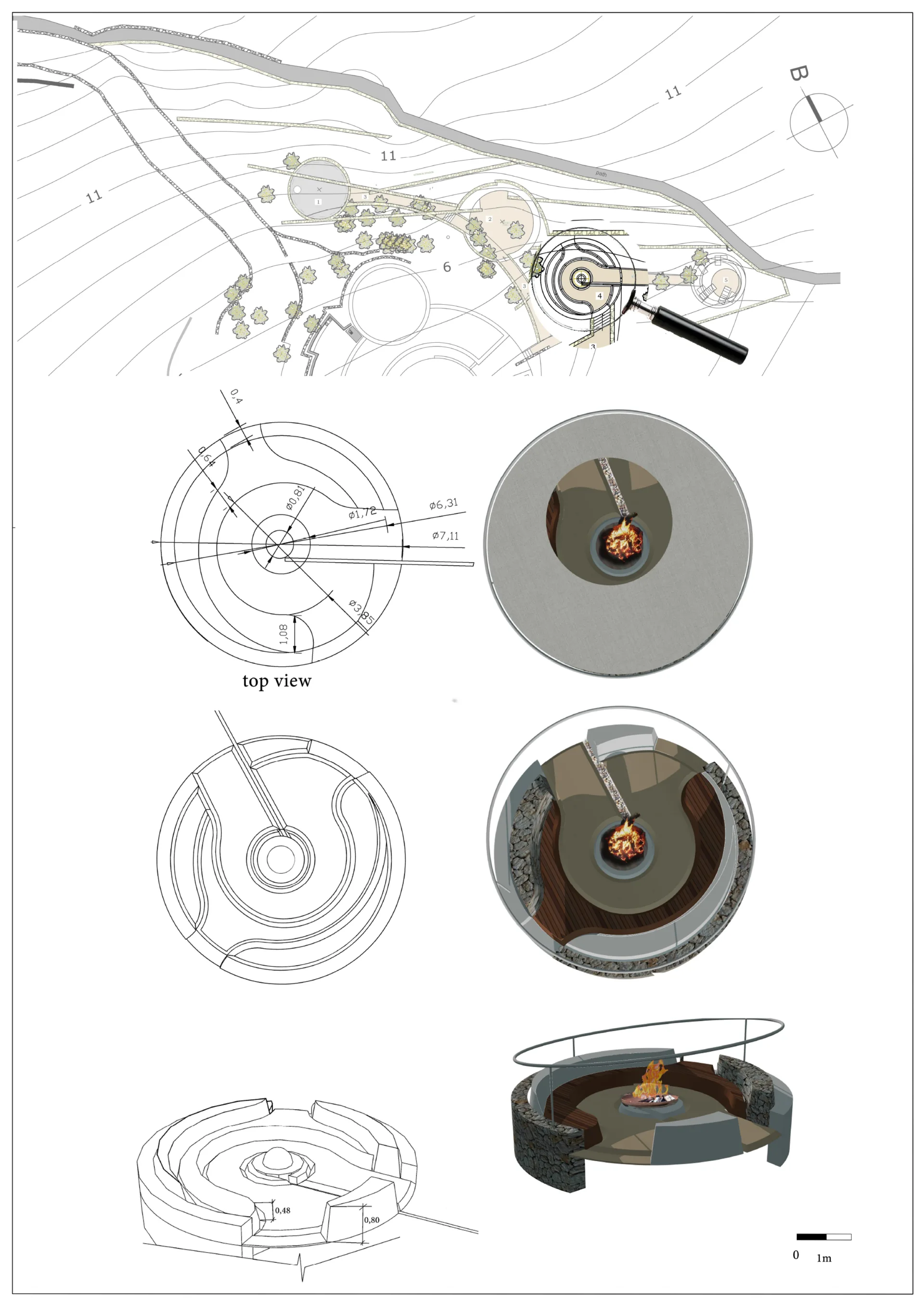 The introverted sunken circular seating can accommodate about 8-10 people. In the middle, a controllable firewood of bioethanol can transform the space aesthetical into pleasant lace day and night. The seating is been studied as a composite construction by coated concrete, gravel wall, wood and stabilized physical floor.