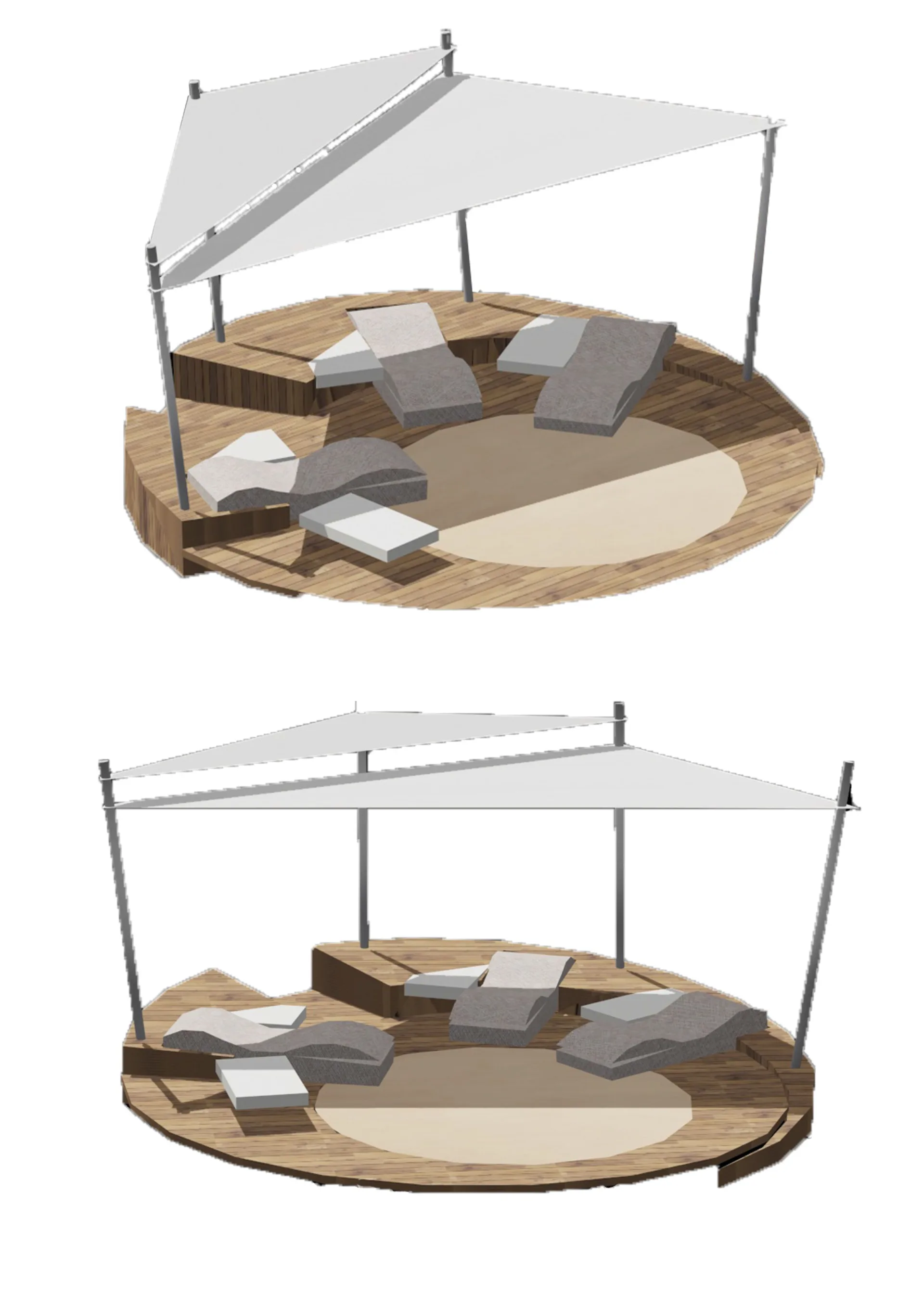 The seats are characterized by mobility, freeing up extra seating areas possibly with cushions. The sunbeds aesthetically would be ideal to be custom-made. The place has been studied of how to be lighted at night with waterproof charging sockets for mobile phones or laptops. The shading will suspended from galvanized stainless steel pipes with a dense shading cloth.