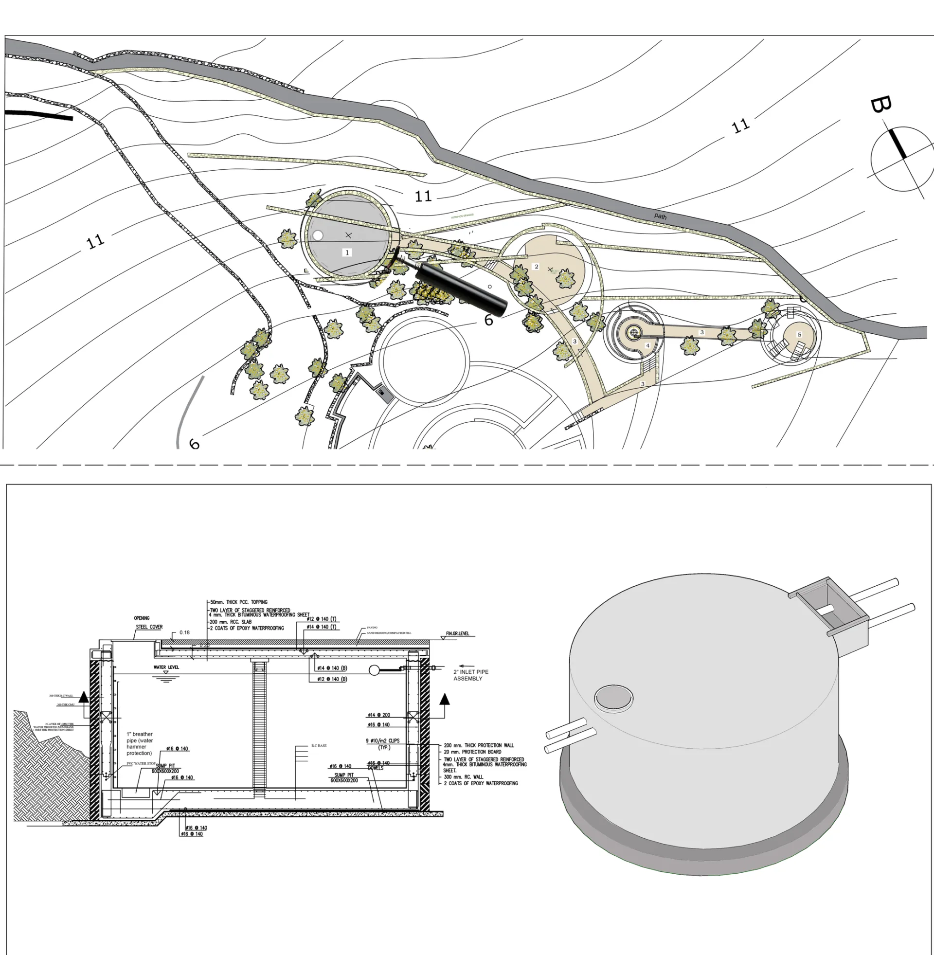 The first platform from the right includes a storage space on the top of an underground cistern of about 70 cubic meters capacity.