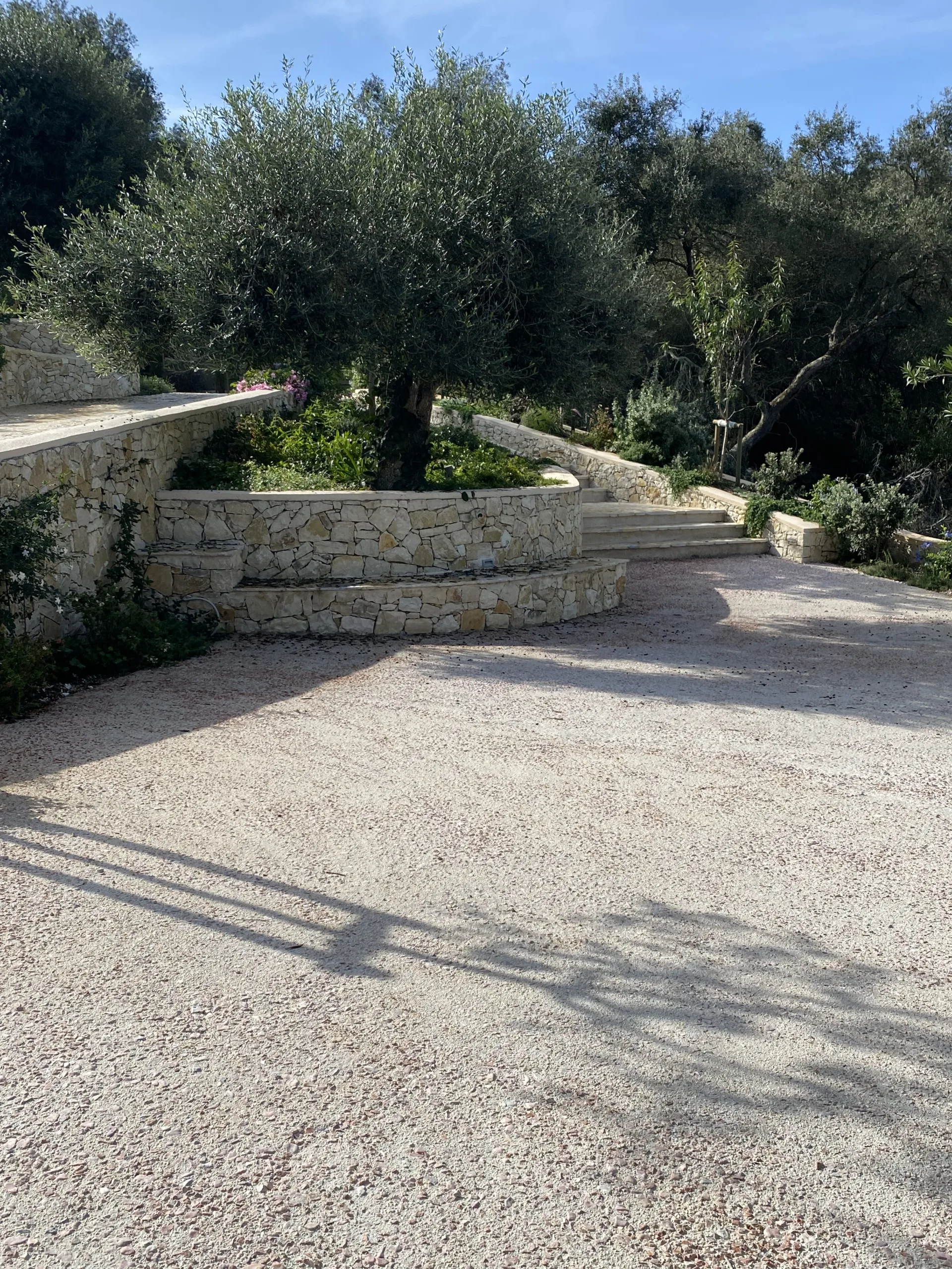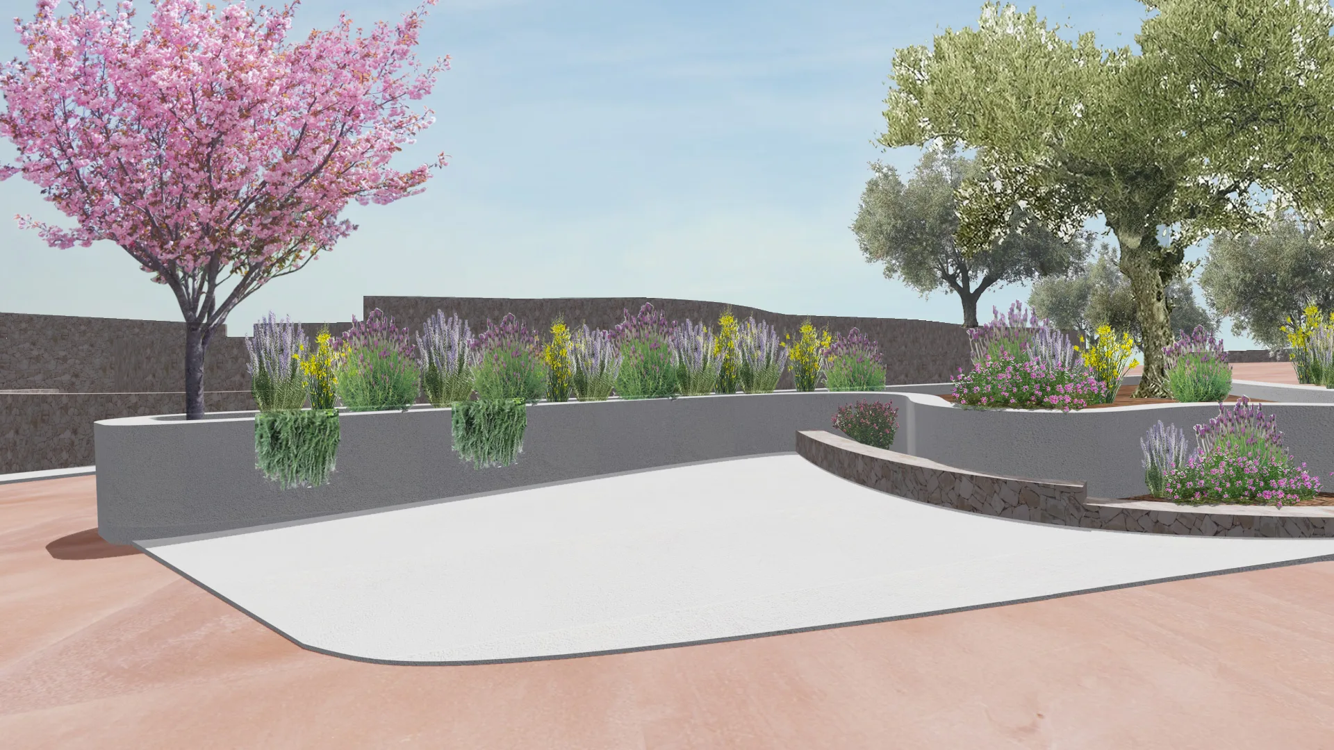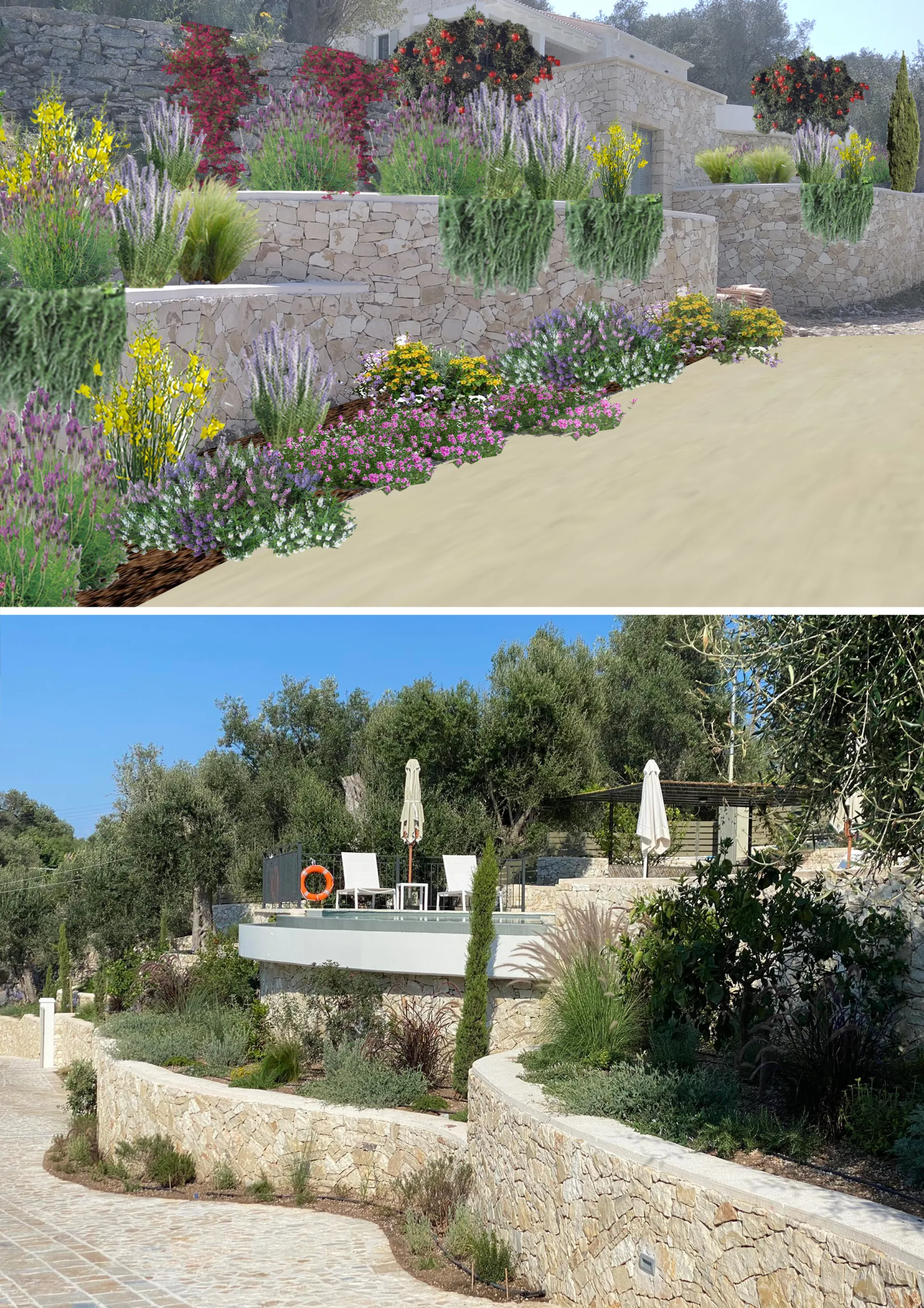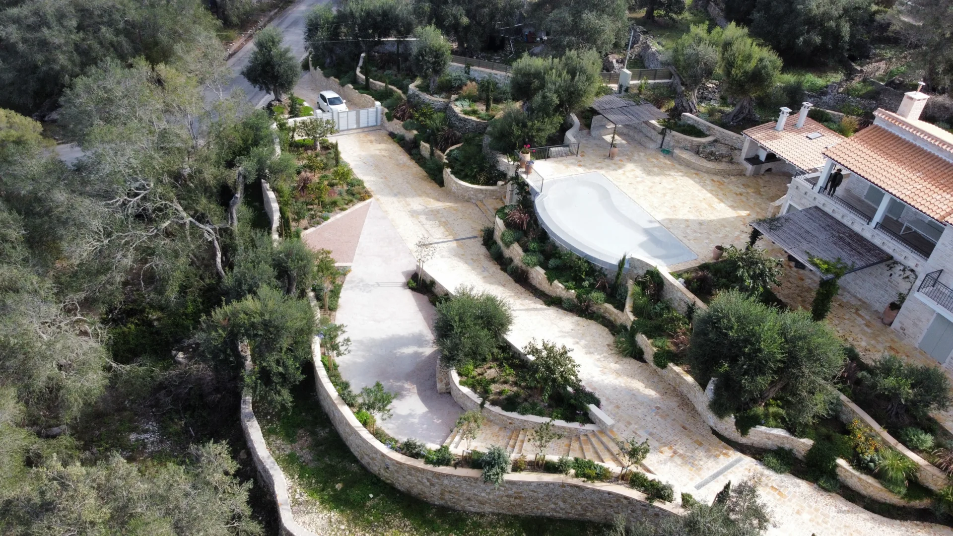 The requirements of the space had to cover the configuration of a visitor’s parking lot and the creation of the garden. The space was studied in order to meet the desire of the local traditional materials of the island’s stone with intent on breaking the monotony of the large design axes. The outdoor was restored with a wealth of both hard and soft materials emphasizing the quality. The adventurous terraced of jardiniers combined with the restoration of the island’s old drystones gives a taste of Ionian traditional elegance old and new.