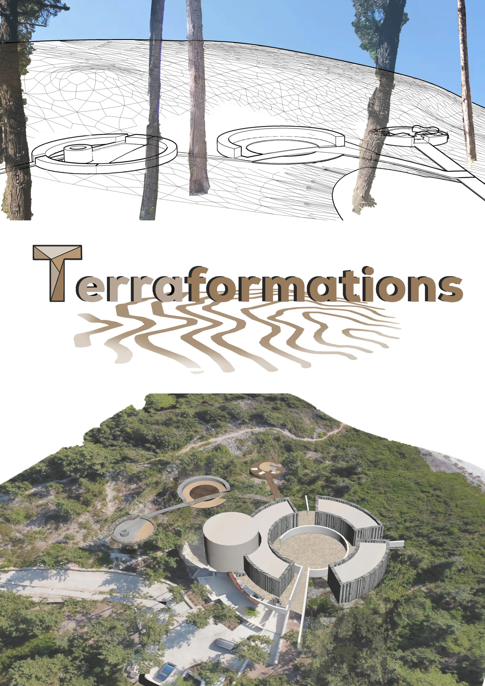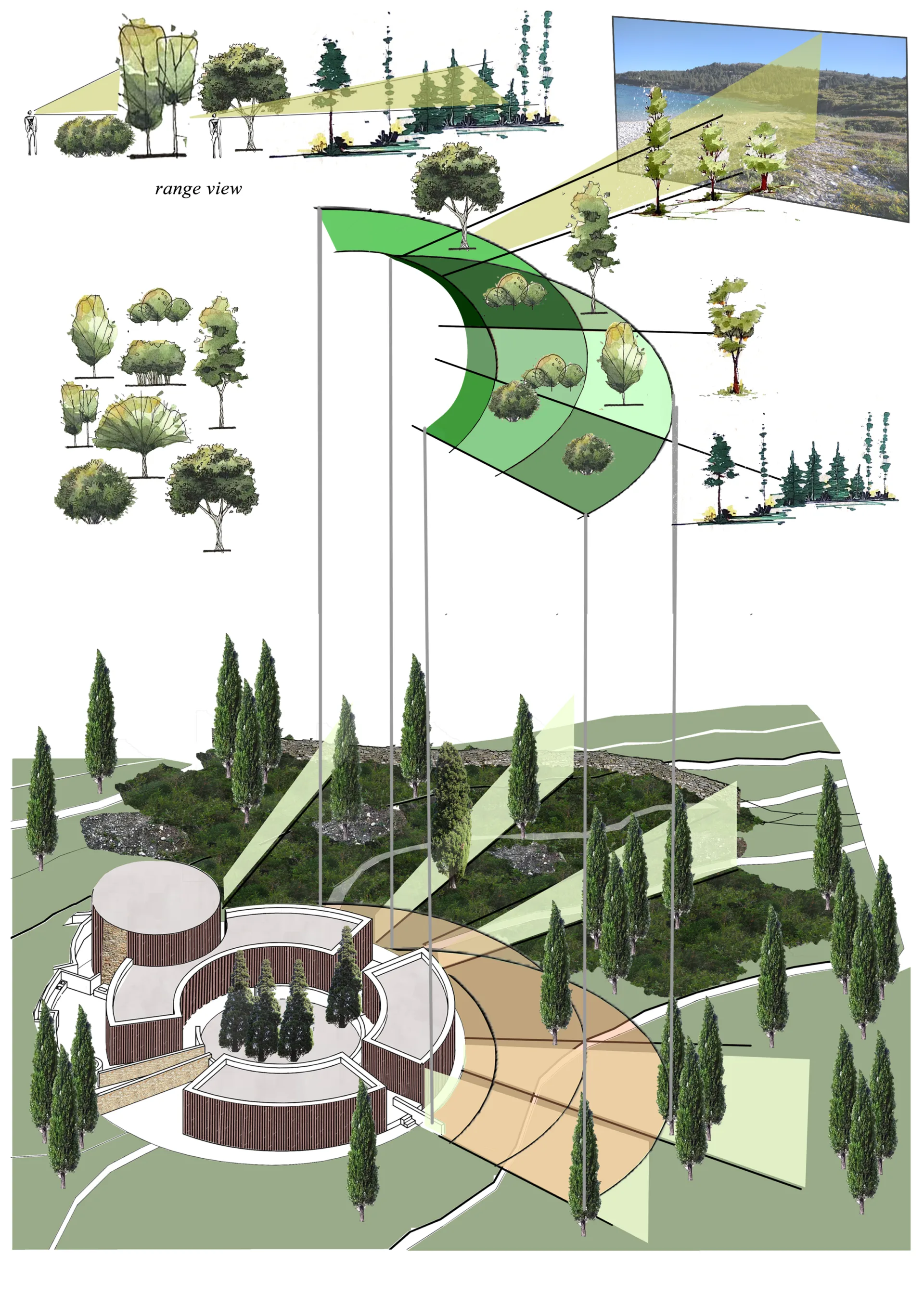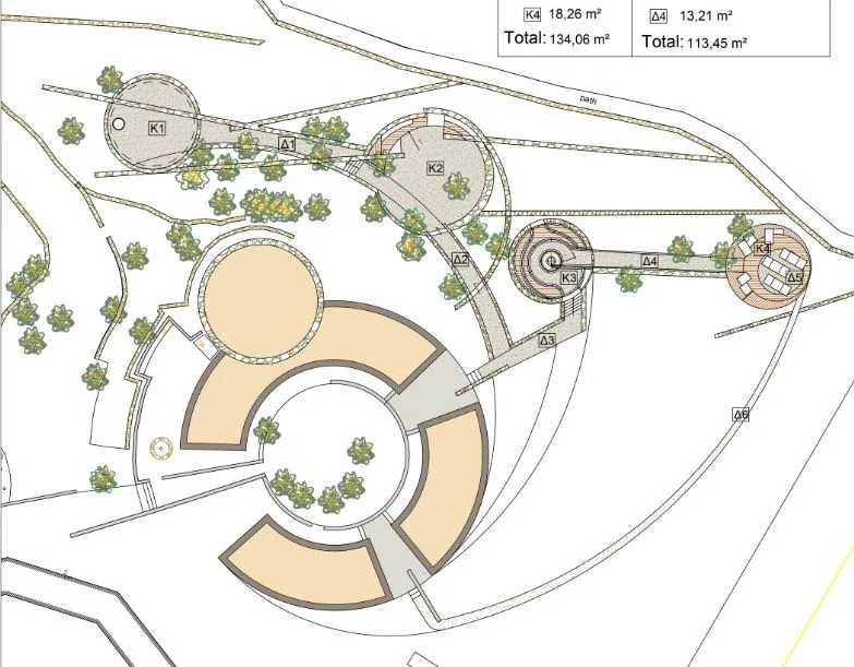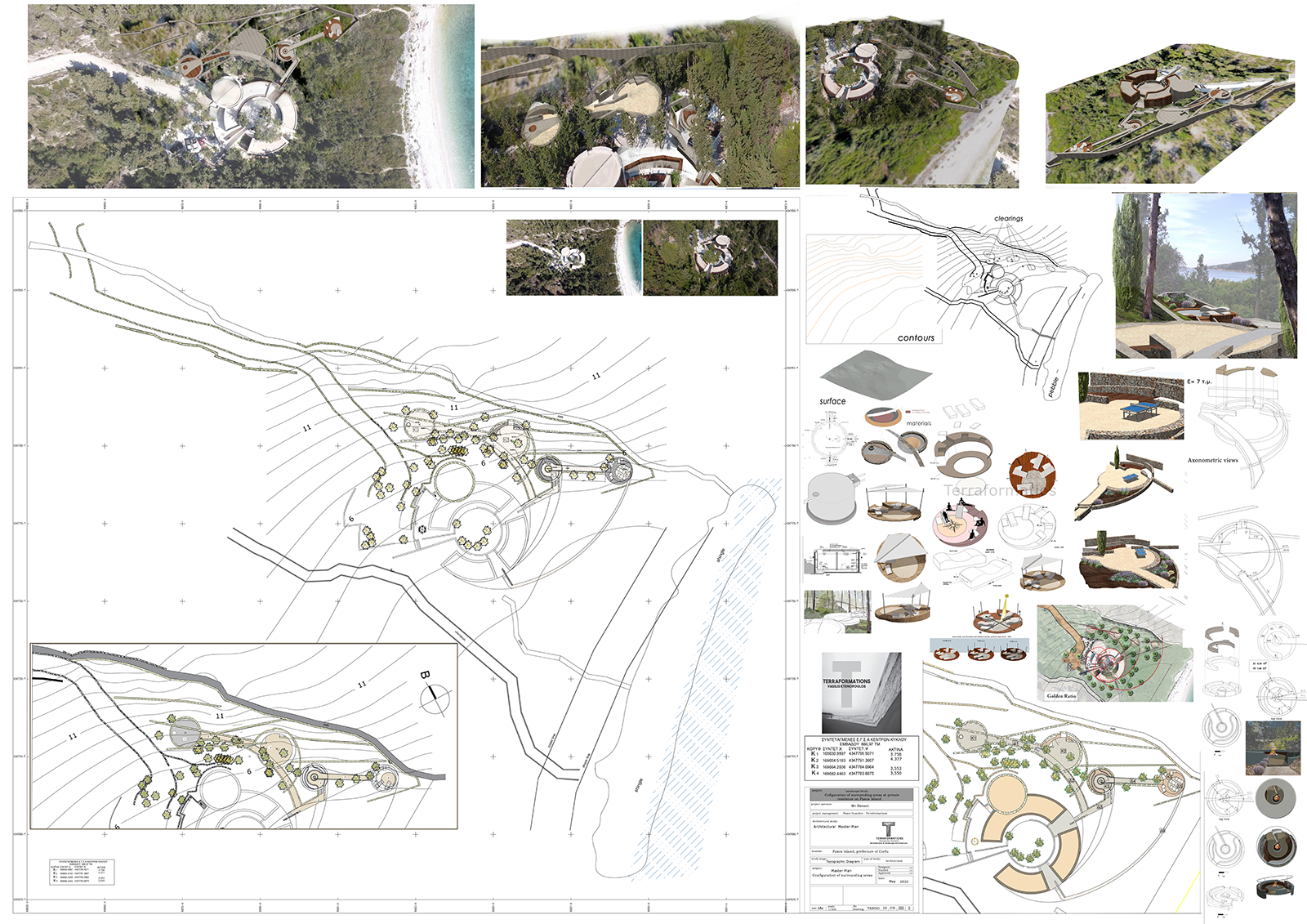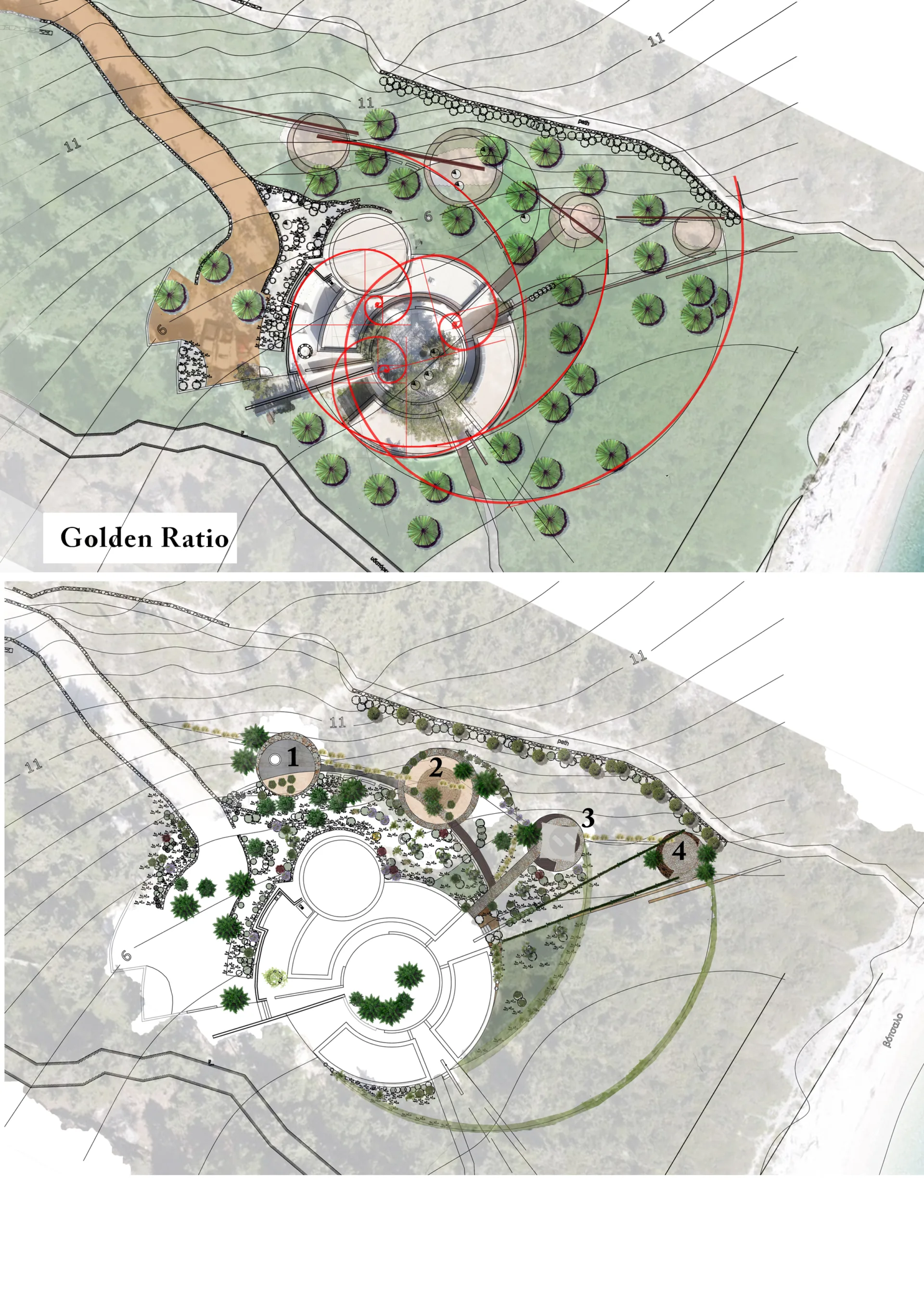 The purity of the design form is observable from birds eye view. For this reason, the challenge is to study a space that would combine as little as possible intervention in its natural landscape, with the purity of a symbolic form that could be observable. The form that we were inspired by was to twist and extend the garden into a radial form that follows the rule of the golden ratio. That leads to platforms of isolation, relaxation and leisure, which embraces the coniferous forest, that frames the views or hides it depending on the visual spots of the observator in a radial direction.