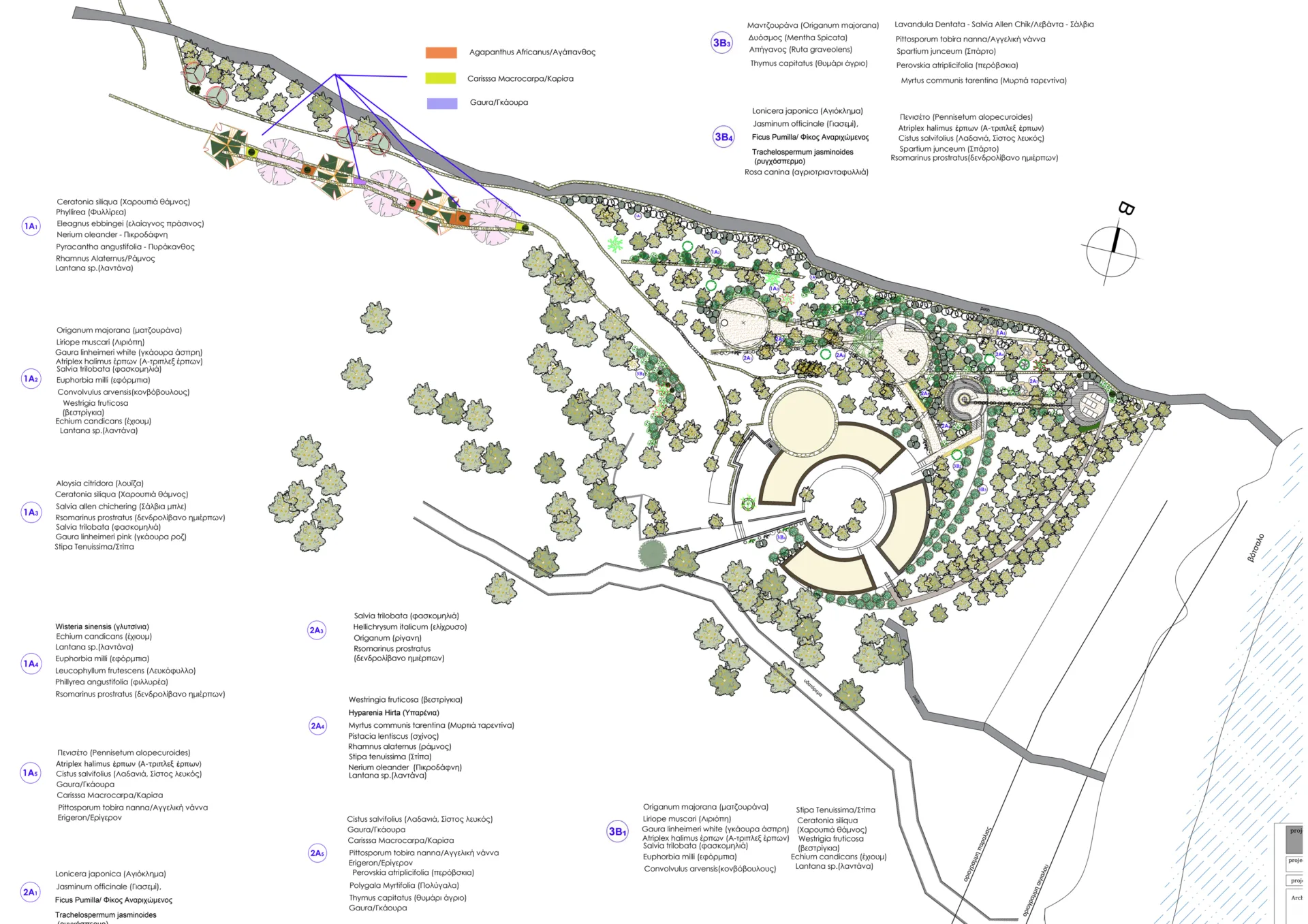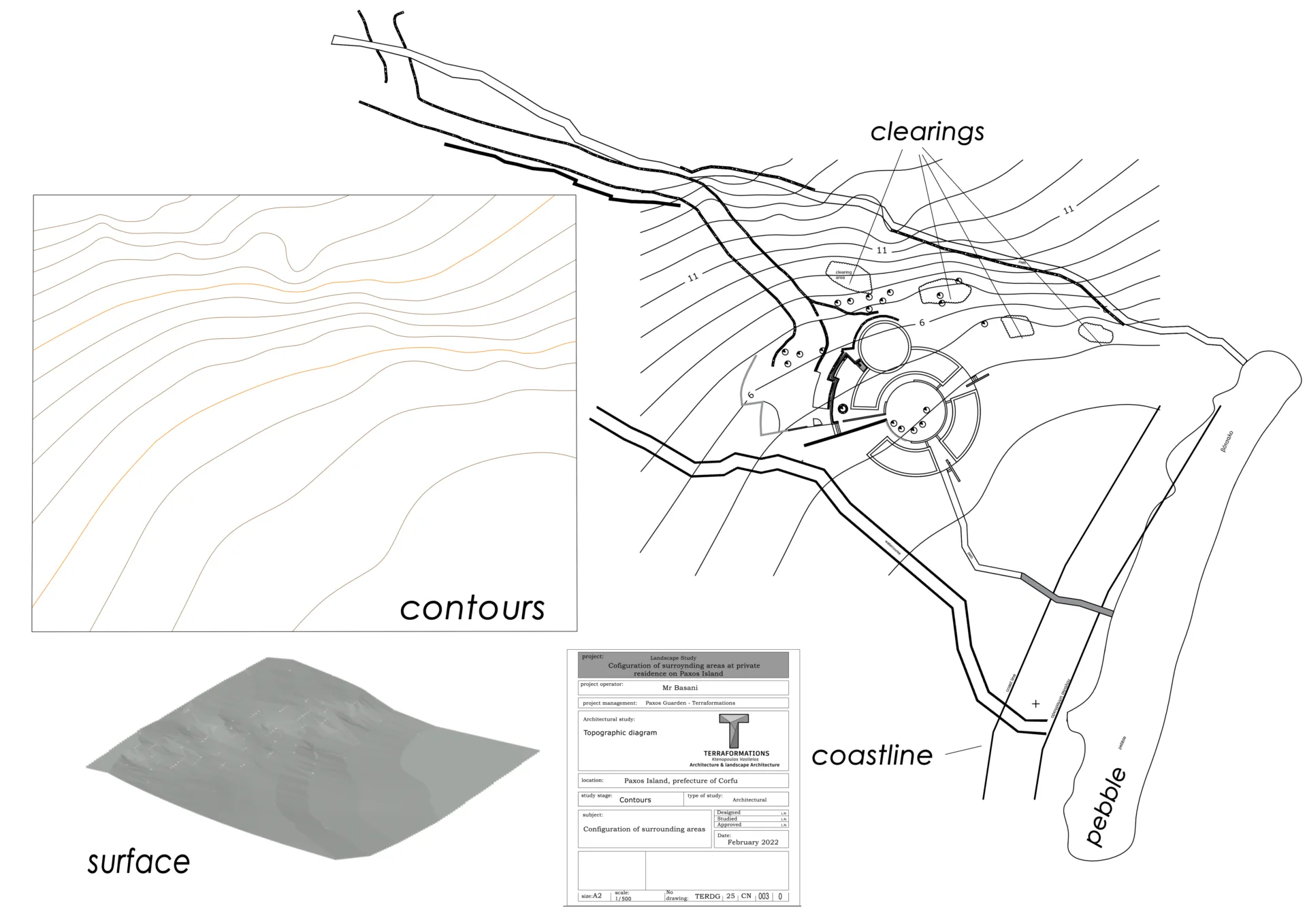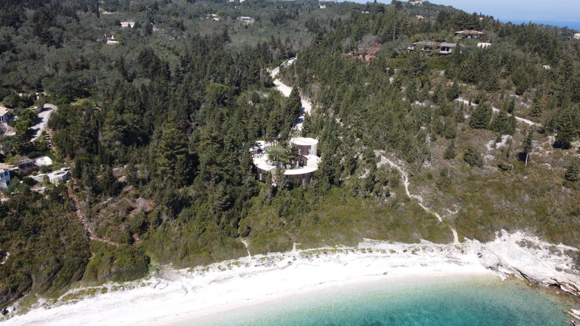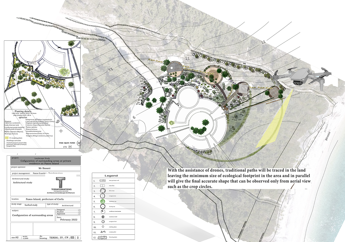 The main idea regarding the surrounding areas of the residence, comes in touch with the fact that the circular shape of the house is based on an introverted strict and logical shape which seems to have landed in a densely forested area.